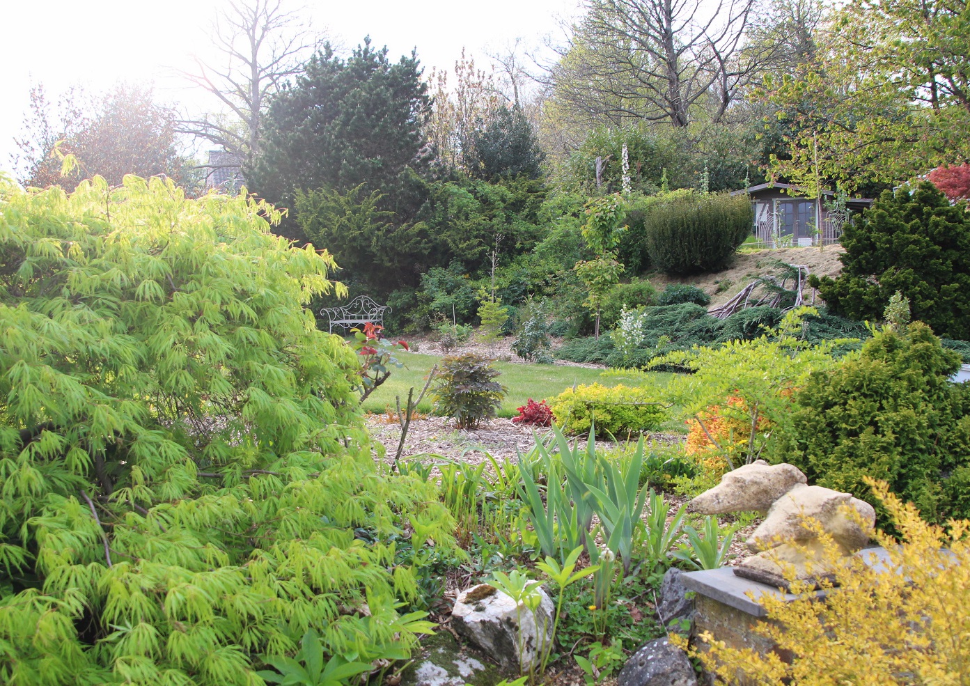 25 avril 2022 – J’aime ces ambiances printanières ! Le vert frais d’Acer dissectum ‘Flavescens’ et le violet bleuté d’un Rhododendron russatum.