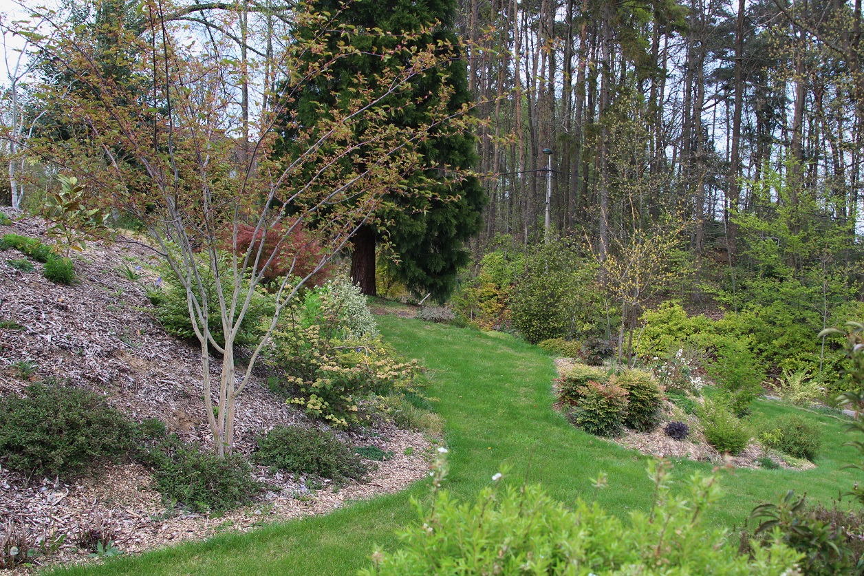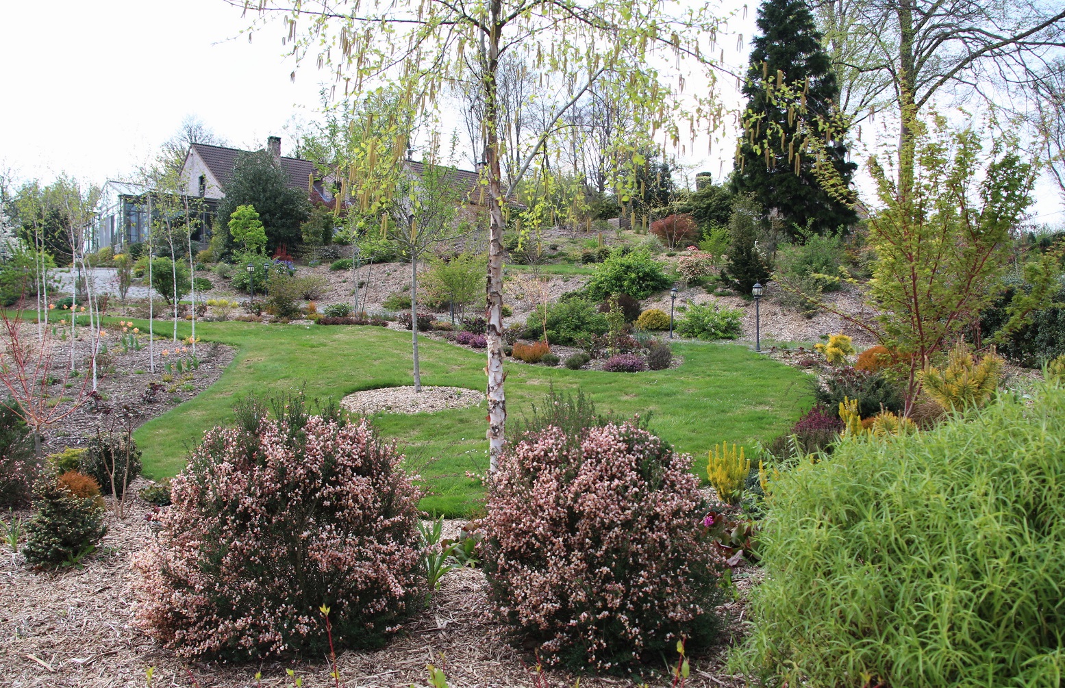 Le gazon n’est pas au top en ce moment car je viens de scarifier toutes les pelouses. Un sacré travail, mais je le fais pour la second année d’affilée, et ça paie ! Le gazon est magnifique, beaucoup plus serré, il y a du coup moins d’indésirables qui s’y installent tout le feutre et la mousse enlevés servent de couvre-sol dans les massifs. Le Prunus serrulata ‘Fugenzo’ continue sa croissance imperturbable. J’ai tenté d’associer son feuillage bronze à la floraison de tulipes ‘Orange Emperor’ que l’on aperçoit entre les bouleaux jacquemontii. Et ça claque !