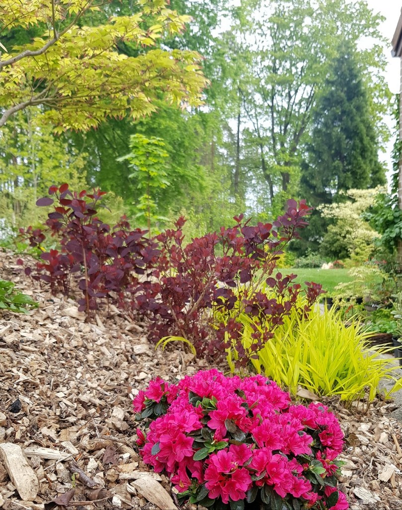 5 mai 2022 – Contrastes de feuillages entre le petit Cotinus ‘Lilla’ et les Hakonechloas