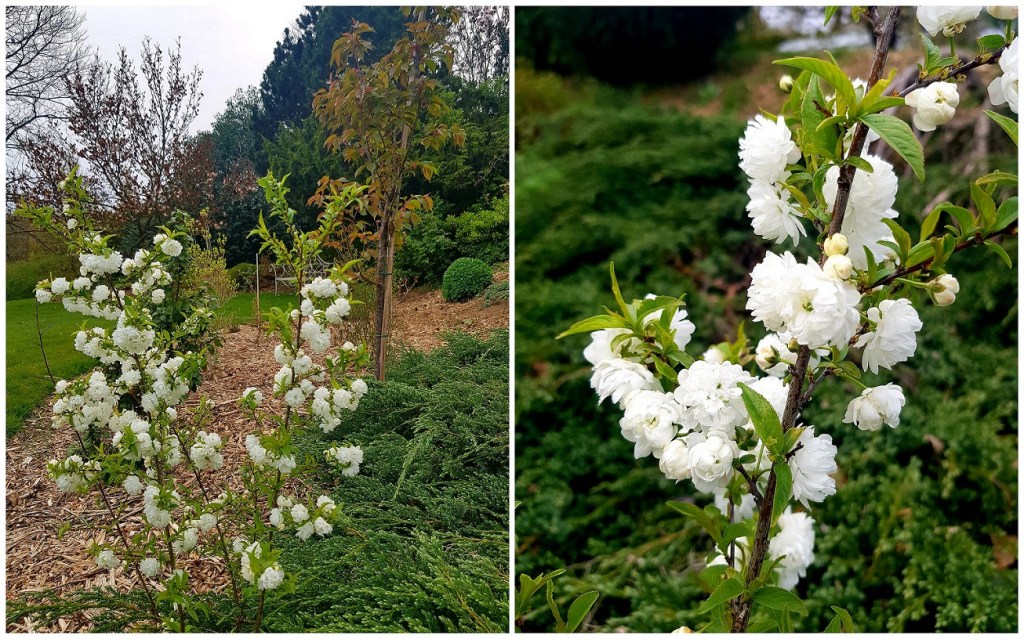 13 avril 2022 – Il existe en rose, mais le voici en blanc : Prunus glandulosa ‘Alba Plena’, qui contraste bien sur fond de Juniperus rampant.