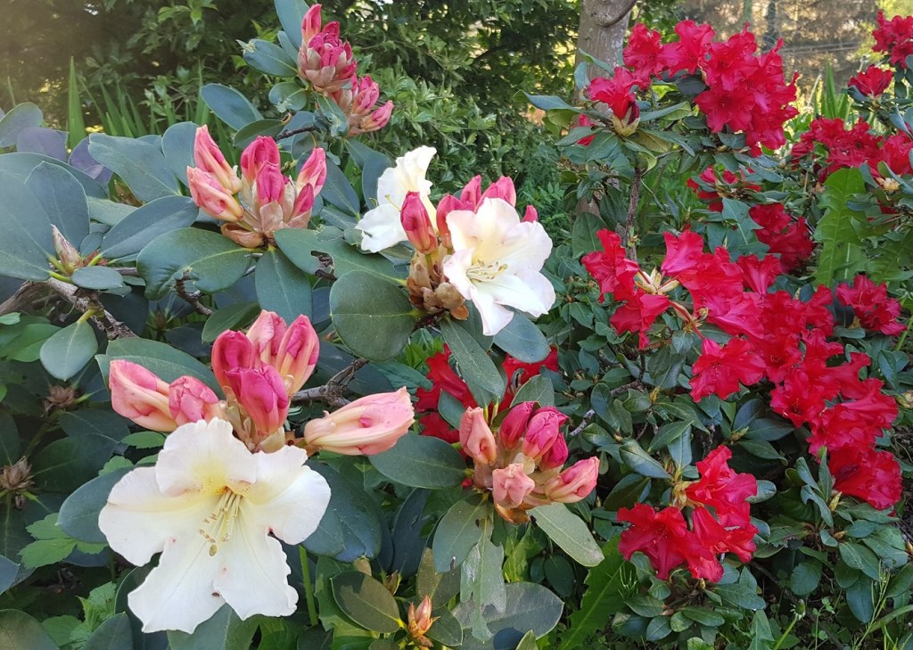 24 avril 2022 – Rhododendrons ‘Horizon Monarch’ et ‘Baden-Baden’. La pluie de l’été dernier leur a été bénéfique !