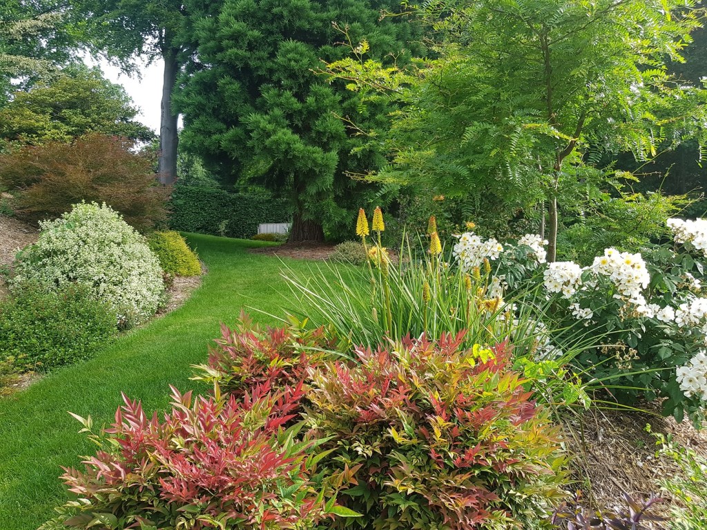18 juin 2022 – Grâce aux pluies de la semaine dernière, le jardin tient parfaitement le coup. Pour le moment, je croise les doigts ! J’aime de plus en plus les Nandina domestica ‘Obsessed’, qu’il ne faut pas hésiter à planter en groupe. Je suis une fan des rosiers belges de Louis Lens. Ici ‘Rosalita’. Sur la gauche, Pittosporum tenuifolium ‘Irene Patterson’ et le merveilleux Acer palmatum ‘Villa Taranto’.