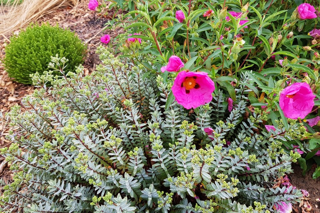 6 juin 2022 – Le Cistus purpureus sera-t-il toujours en fleurs quand les boutons du Hebe ‘Red Edge’ s’ouvriront ? That is the question. Mais déjà comme cela, l’association me plaît beaucoup !
