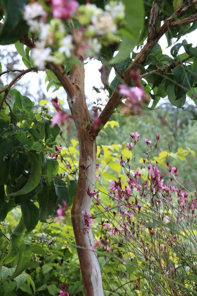 Atout supplémentaire de ce bel arbre : son écorce, qui se desquame joliment. Cependant, après avoir vu en 2019 dans le jardin des Vieilles Vignes, chez Simone Rivaton, un exemplaire dont l’écorce était pelée, j’ai décidé de le peler aussi, tant j’aime ce tronc lisse aux belles nuances !