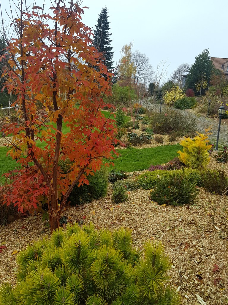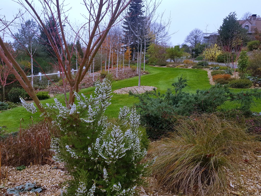 25 septembre 2022 : L’automne arrive et l’Acer palmatum ‘Sango-kaku’ nous le fait savoir et fait écho aux bruyères.
