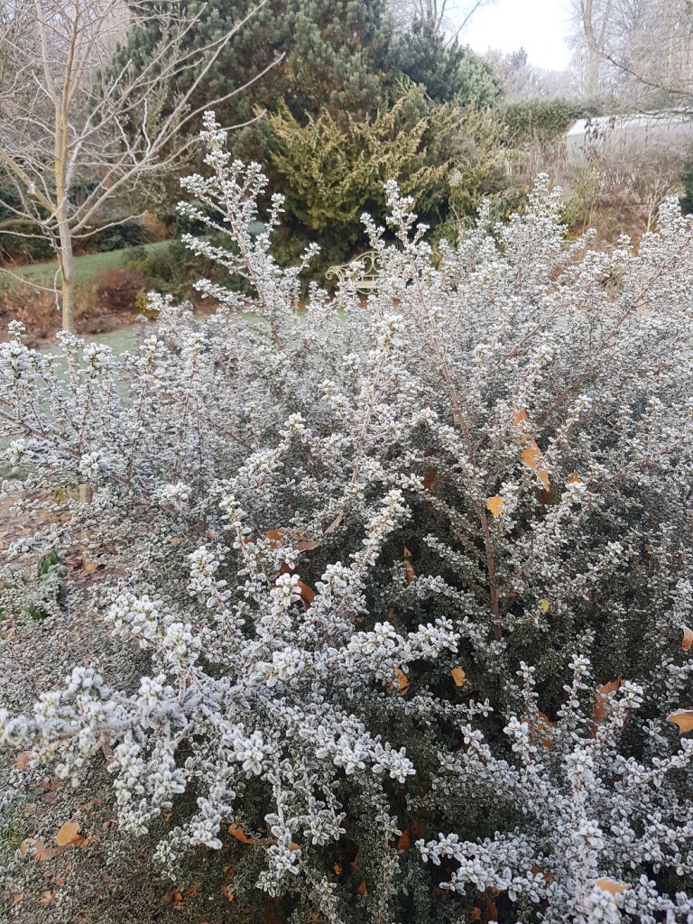 Le givre a enrobé les toutes petites feuilles du Ceanothus ‘Puget Blue’. Il devrait normalement tenir face à ces températures nocturnes, du moins je l’espère !