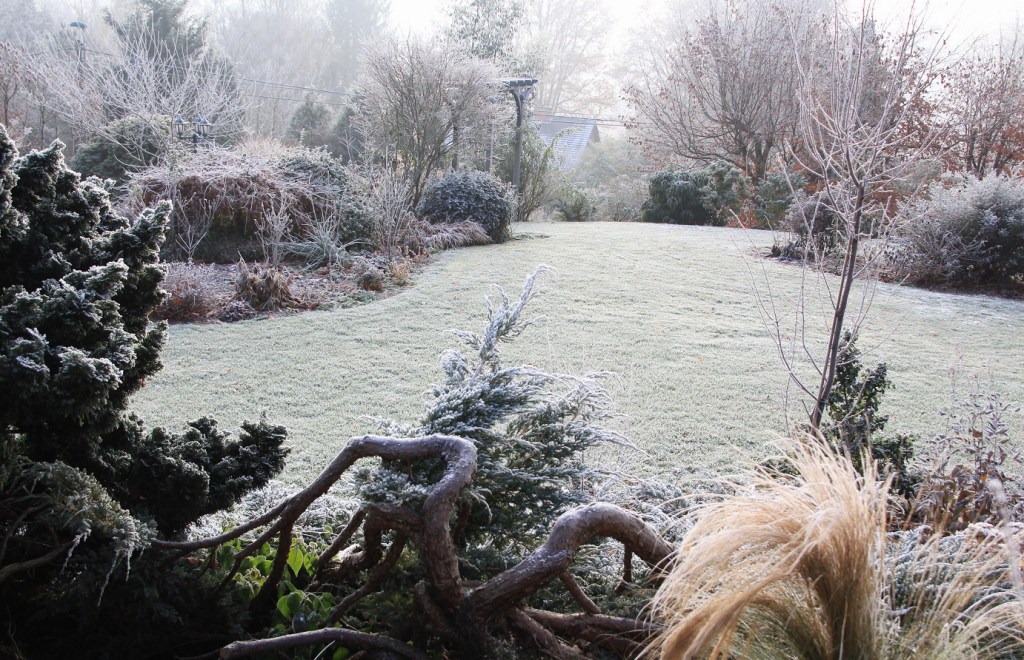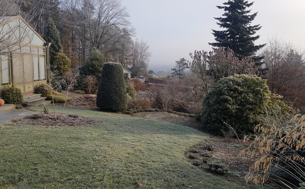 La nuit la plus froide (-10°C) de cet épisode hivernal a déposé ce matin sur le jardin, tel du sucre glace, un tapis de givre du plus bel effet ! L’ambiance feutrée a finalement fait place au soleil, imposant une petite sortie photos.