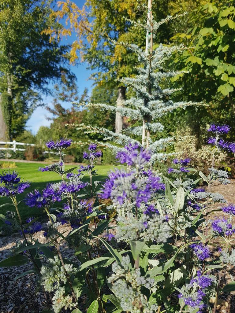 6 octobre 2022 : Nouveau au jardin, le bleu intense de Caryopteris clandonensis ‘Thetis‘, en fleurs actuellement. Avec bien sûr un conifère bleu pour l’accompagner.